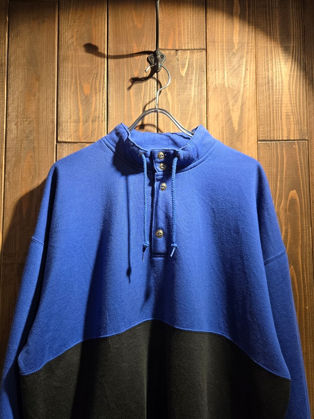 1990年代 チーター スウェット。 アメリカのデパートMERVYN'Sのプライベートブランドの『CHEETAH』 無地やボーダーのアイテムを良く作っているイメージのあるブランドです。 こちらもCHEETAHのイメージ通りのブルー×ブラックのバイカラーのスウェット。 珍しいヘンリータイプのモックネックになります。 XLとビッグサイズ。 1枚でも着やすいアイテムです。 使用感、小傷。 【サイズ】肩幅66cm 身幅65cm 着丈69cm 袖丈58cm ※測定方法により若干の誤差が生じる場合がございますのでご了承ください。