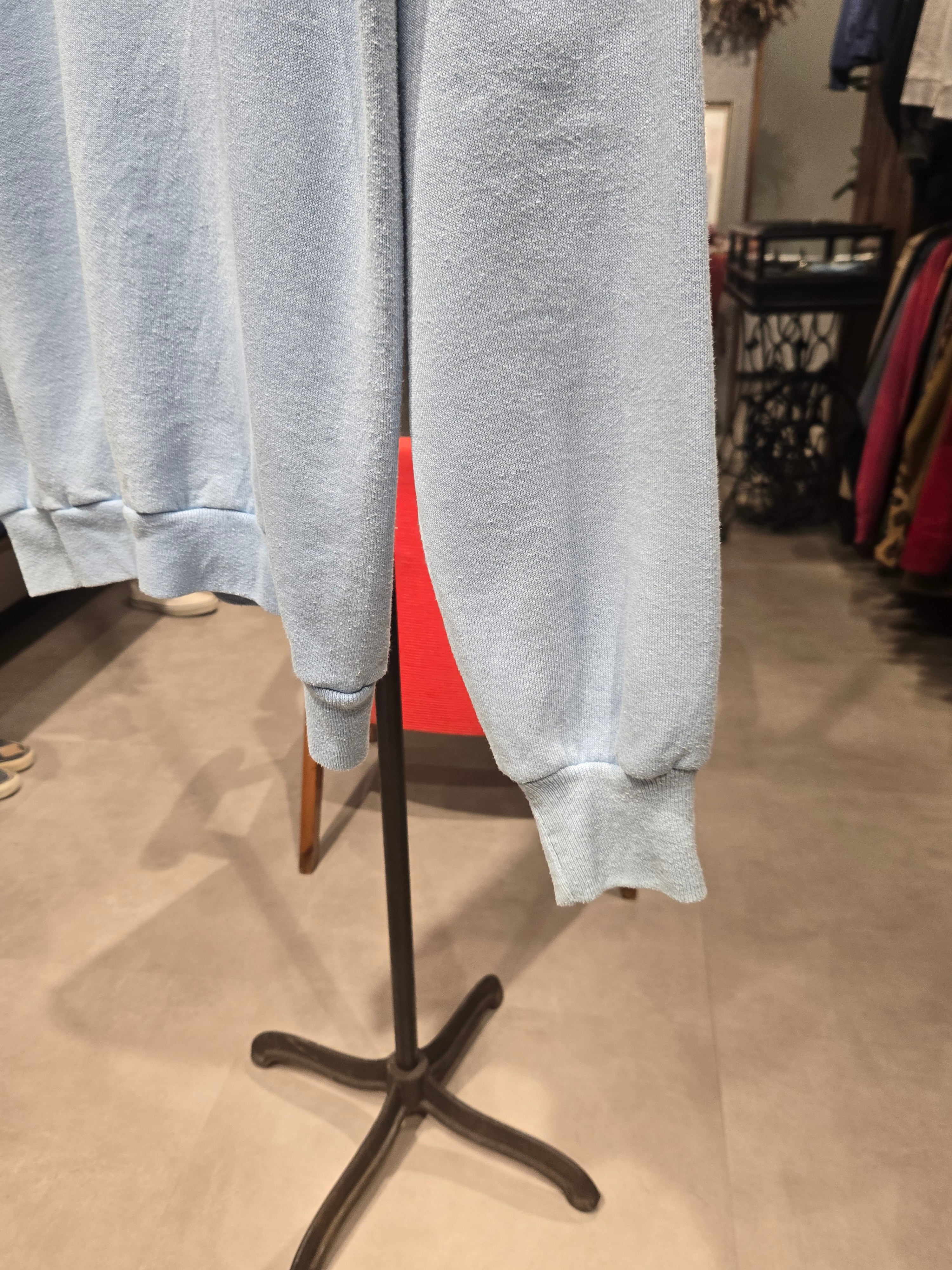 写真だと上手く色が出ませんでしたが、良いライトブルーのラグランスウェット。