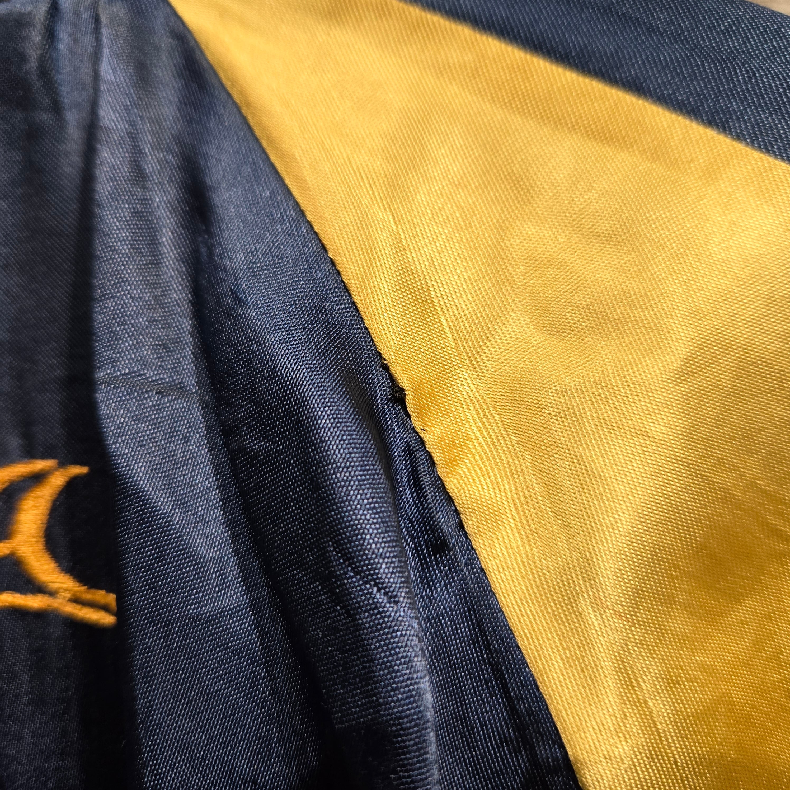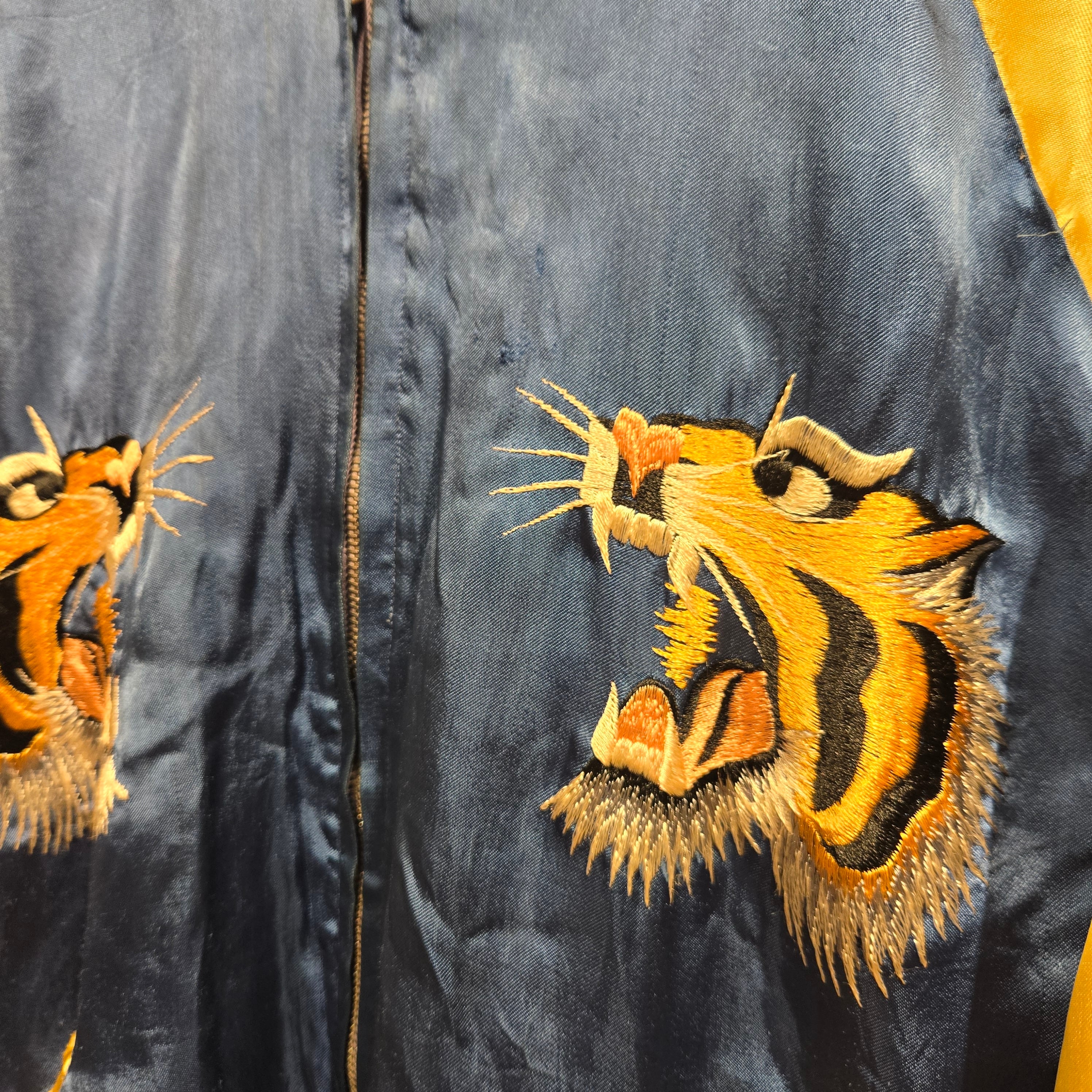 裏面はスカジャンの定番とも言えるブルー×イエローのサテン生地で刺繍は『虎』。
